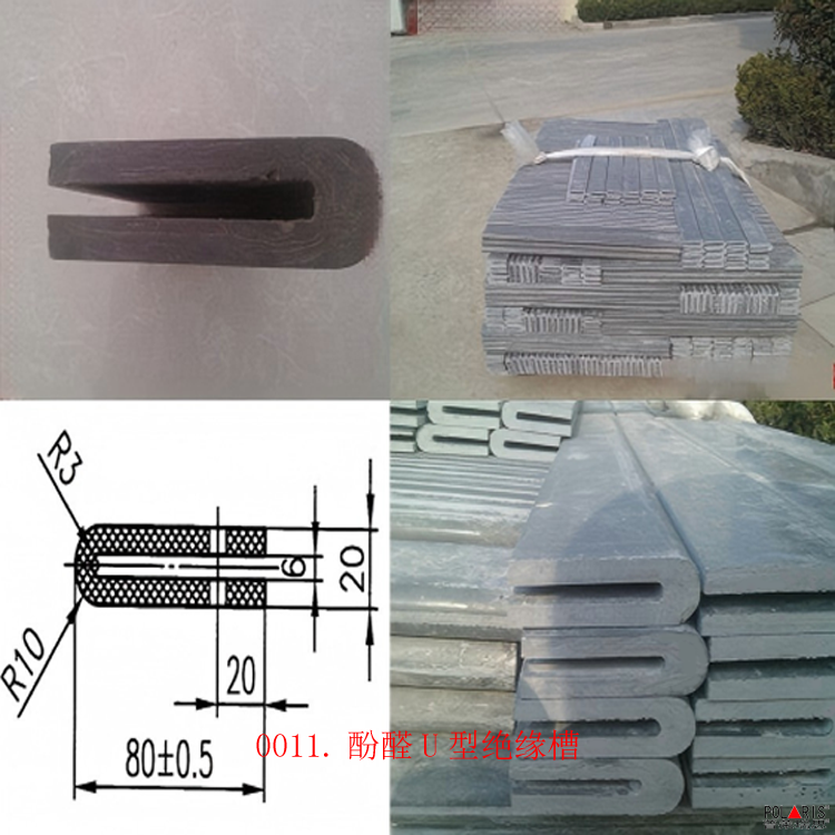 酚醛U型绝缘槽以酚醛树脂为基体,经模压成型,结构为U型槽状,具有电气绝缘优良、机械强度高、耐磨、耐潮、尺寸稳定等特点。产品介电性能稳定,耐高温、不易变形,可对导线、铜